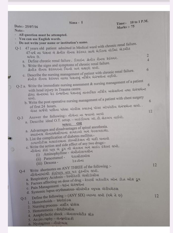 Q-1. 47 years old patient admitted in Medical ward with chronic renal failure. 47વર્ષ ના પેશન્ટ ને ક્રોનિક રીનલ ફેલ્યોર્ર સાથે મેડીકલવોર્ડમાં દાખલ કરવામાં આવ્યા છે