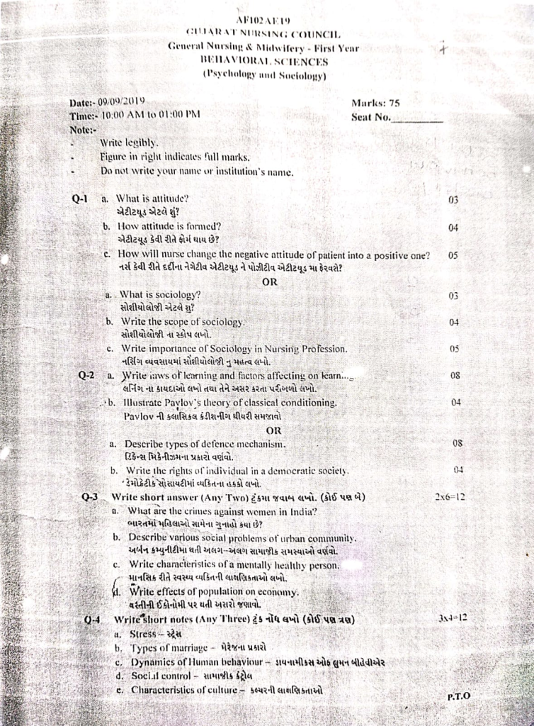 GNM FY BEHAVIOUR SCIENCE-2019 (PAPER NO. : 3 )