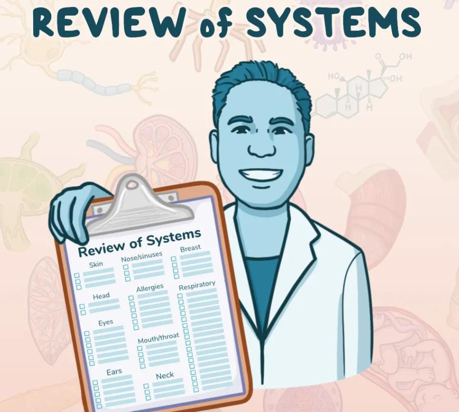 રિવ્યુ ઓફ સિસ્ટમમાં પેશન્ટની સિસ્ટમ વાઇસ ડેટા કલેકટ કરવામાં આવે છે જેમાં બોડીની બધી સિસ્ટમનો સમાવેશ કરવામાં આવે છે જેથી રિયલ પ્રોબ્લેમને આઇડેન્ટીફાય કરી શકાય.