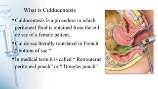 પાઉચ ઓફ ડોગ્લાસ માથી ટ્રાન્સવજાઇનલી પેરિટોનીયલ ફ્લુઇડ ને એસ્પીરેશન કરવામા આવે તો આ કન્ડિશન ને કલ્ડોસિન્ટેસિસ કહેવાય છે.