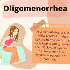 ઓલીગોમેનોરીયા એ એવી કન્ડિશન છે કે જેમાં મેન્સ્ટ્રુએસન બ્લીડિંગ એ 35 દિવસ કરતા વધારે સમય પછી થાય છે અને તેજ ડ્યુરેશન માં કોન્સ્ટન્ટ રહે છે.