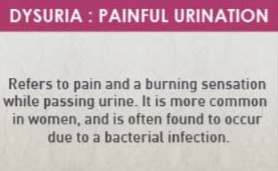 યુરિન પાસ કરવામા ડિફીકલ્ટીસ હોય આ કન્ડિશન ને ડિસયુરિયા કહેવામા આવે છે.