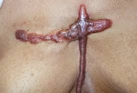કિલોઈડ્સ ઇરરેગ્યુલર, થીક સ્કાર છે. જે એબનોર્મલ વુંડ હીલિંગ પ્રોસેસને કારણે જોવા મળે છે.