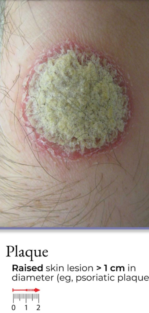 પ્લેક એ પેપ્યુલ જેવી જ રચના છે (એલિવેટેડ પાલપેબલ) પરંતુ તેની સાઈઝ 1 cm કરતાં વધારે જોવા મળે છે.