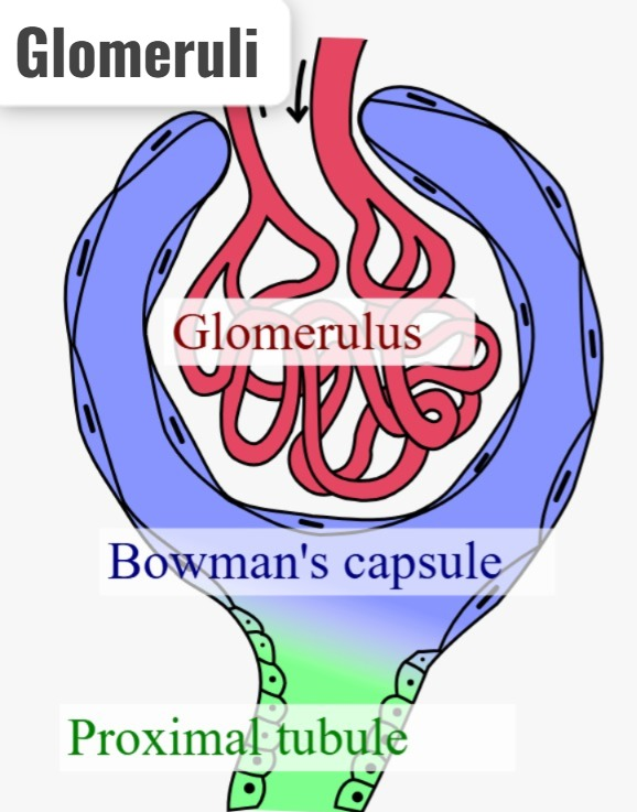• ગ્લોમેરુલાઈ એ ટાઈની બોલ શેપ સ્ટ્રક્ચર છે કે જે કિડનીમાં આવેલા હોય છે તે મુખ્યત્વે બ્લડ ના ફિલ્ટરેશન માં અગત્યનો ભાગ ભજવે છે અને યુરીન નું ફોર્મેશન કરવામાં જવાબદાર હોય છે. એક કિડની માં thousands of ફિલ્ટરેશન યુનીટ આવેલા હોય છે તેમાં કેપેલારીસ આવેલી હોય છે અને તે મેમ્બરેન દ્વારા સરાઉન્ડેડ થયેલા હોય છે તેનું મેઇન વર્ક એ વેસ્ટ પ્રોડક્ટ ,એક્સેસ વોટર તથા ઇલેક્ટ્રોલાઇટ ને ફિલ્ટર કરવામાં અગત્ય નો ભાગ ભજવે છે.}