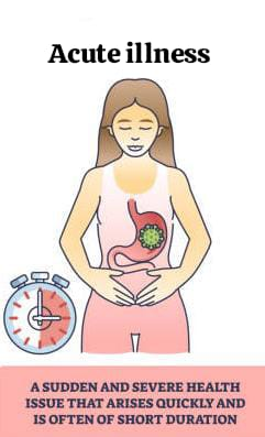 આમા સિવ્યર સિમ્પટોમ્સ જોવા મળે છે. જે શોર્ટ ડયુરેસન માં જોવા મળે છે. થોડાક દિવસો અથવા વિક બીમારી જોવા મળે છે. જે ઝડપથી થાય છે. જેમા તાત્કાલિક સારવાર પ્રોવાઇડ કરવામા આવે છે. એના કોમન કારણ વાઇરસ ઇન્ફેક્શન અથવા ઇન્જ્યુરી છે. આ ઈલનેશ ટૂંક સમયમા નોર્મલ પણ થઇ જાય છે.