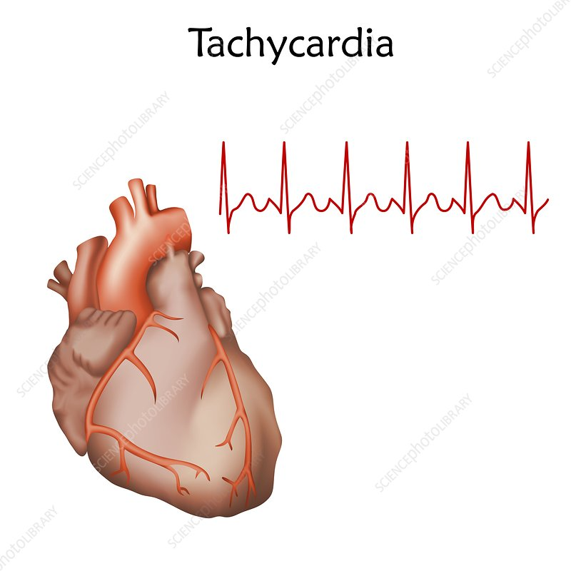 આ કન્ડિશનમા હાર્ટ રેટ ઇન્ક્રીઝ જોવા મળે છે. જેમા એડલ્ટમા મુખ્યત્વે ૧૦૦ bpm થી હાર્ટ રેટ વધી જાય છે. આ કન્ડિશનને ટેકીકાર્ડિયા કહેવામા આવે છે.