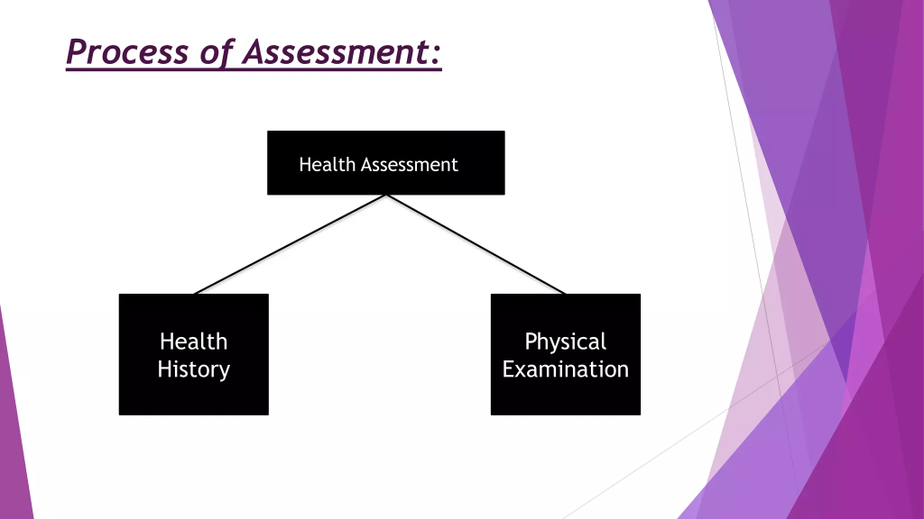 અસેસમેન્ટ એટલે કે પેશન્ટના હેલ્થ ને લગતી ઇન્ફોર્મેશન કલેક્ટ કરવાની સિસ્ટેમિક અને ઈરાદાપૂર્વક પ્રોસેસ જેને એસેસમેન્ટ કહે છે.