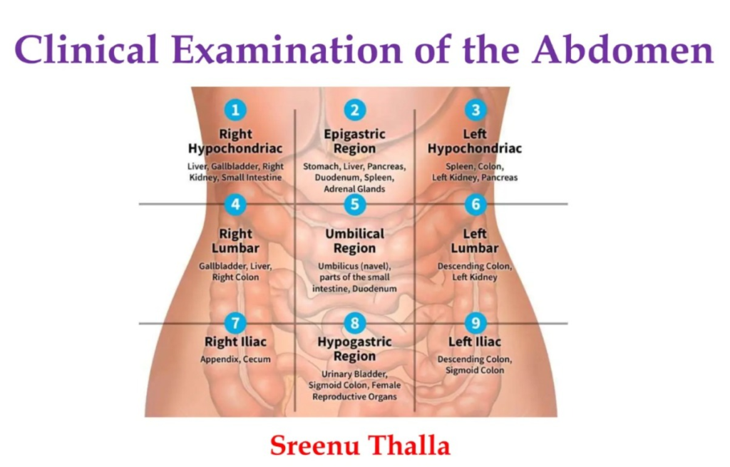 એબડોમીન રિફ્લેક્સ માટે એબડોમીન નું અ સેસ કરવું.જેમાં , ફ્લુઈડ: શિફ્ટિંગ ડલનેસ, fluid વેવ દુખાવો: ટેન્ડરનેશ ફ્લોટિંગ માસ: બે લોટમેન્ટ.