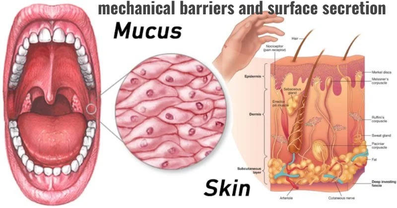 7)mechanical barriers and surface secretion (મિકેનિકલ બેરિયર અને સર્ફેસ સિકરીસન).