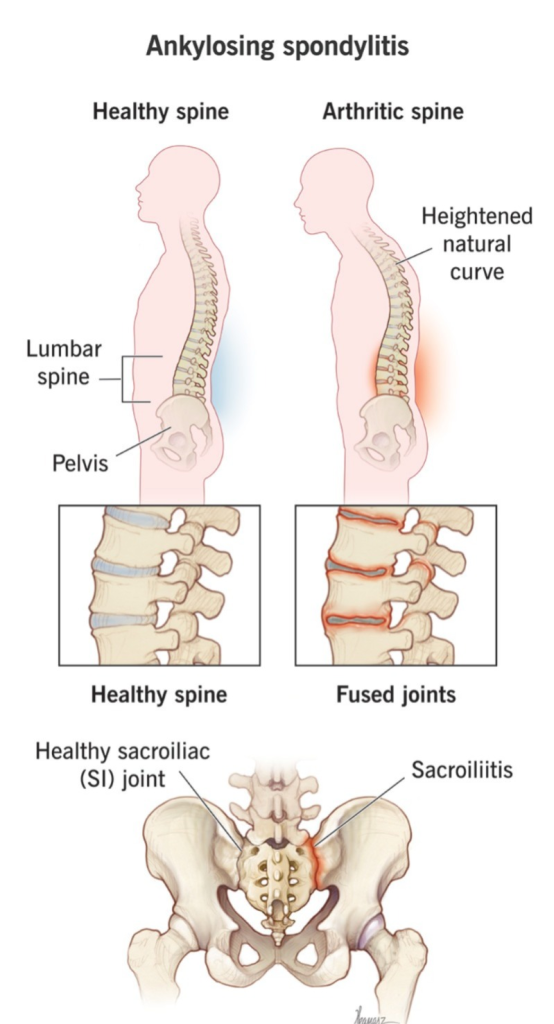 એંકાયલોસીસ સ્પોંડીલાઇટીસ એ ક્રોનિક ઇન્ફ્લામેટ્રી ડિસઓર્ડર છે.આ ડીઝિઝ એ બોડીમાં સૌથી પહેલા એક્ઝિઅલ સ્કેલેટલ ( Axial skeletan) ને અફેક્ટ કરે છે સાથે સાથે spinal cord ( vertebral joint and large joint) પણ અફેક્ટ કરે છે આમાં મુખ્યત્વે vertebral column માં Pain , stiffness જોવા મળે છે.
