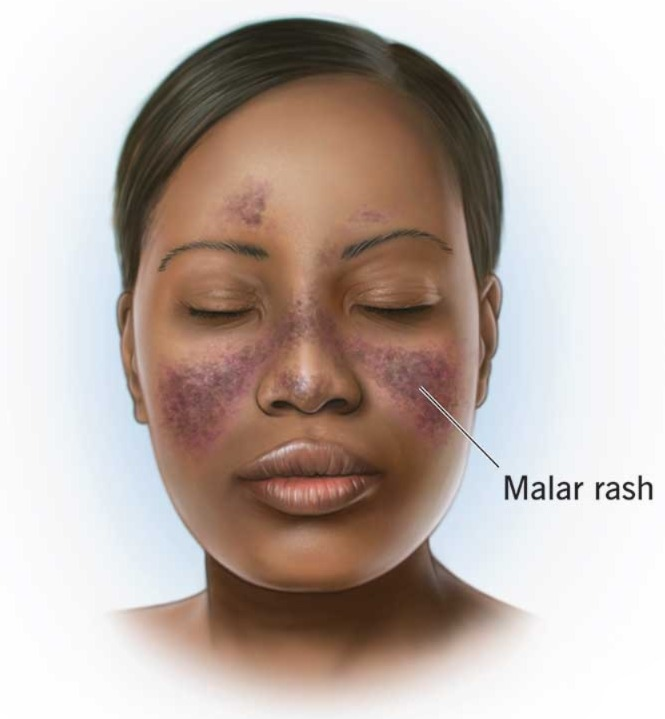 Butterfly shape red colour rash on face (ફેસ પર રેડ કલરના બટરફ્લાય રેસ જોવા મળે છે).Rash is flate, raised and rashes are worse by sun exposure.