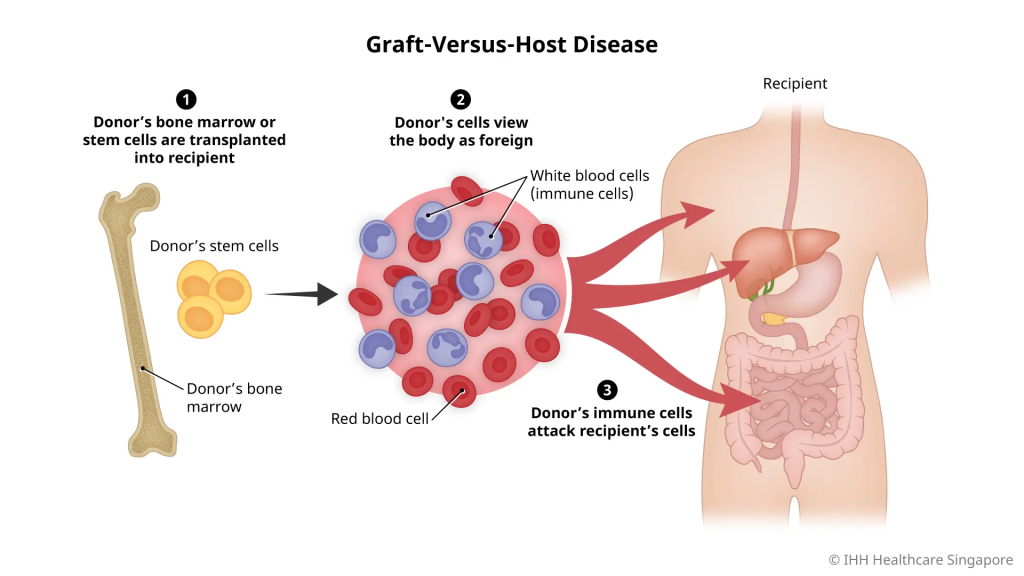 GVHD એટલે donor ની ઇમ્યુન સેલ્સ host ના ટિશ્યુ સામે રિએક્શન કરે છે અને host ના ઓર્ગન્સ જેમ કે સ્કિન, લીવર અને ઇન્ટેસ્ટાઇનને નુકસાન પહોંચાડે છે. આ સિવ્યર અને ક્યારેક લાઇફ થ્રીએટનીન્ગ કન્ડિશન બની શકે છે. ટાઇમ્લી આઇડેન્ટીફીકેશન અને પ્રોપર ઇમ્યુનોસપ્રેસિવ ટ્રીટમેન્ટ થી પેશન્ટ ની લાઇફ બચાવી શકાય છે.