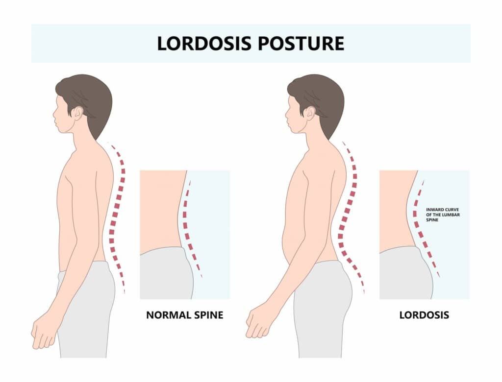 • તેથી Lordosis મા ” sway back “(સ્વેબેક:= સ્વેબેક એટલે પેલ્વિક એ આગળની તરફ tilt( ઝૂકવું) થાય છે તથા એબડોમન એ બહાર( protrude) નીકળી જાય છે)જોવા મળે છે.