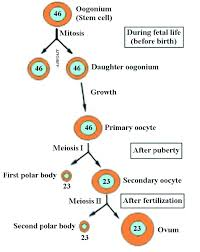 • જ્યાં સુધી પ્યુબર્ટી ન આવે ત્યાં સુધી પ્રાઇમરી oocytes ફર્સ્ટ મેયોટિક ડિવિઝન ને ફિનીસ્ડ કરતા નથી. પ્યુબર્ટી સમયે, લગભગ 40,000 પ્રાઇમરી oocytes પાછળ રહી જાય છે, બાકીના એટ્રેટિક હોય છે. આમાંથી લગભગ 400 જેટલા સમગ્ર રીપ્રોડક્ટિવ પિરિયડ દરમિયાન ઓવ્યુલેટ થાય છે.