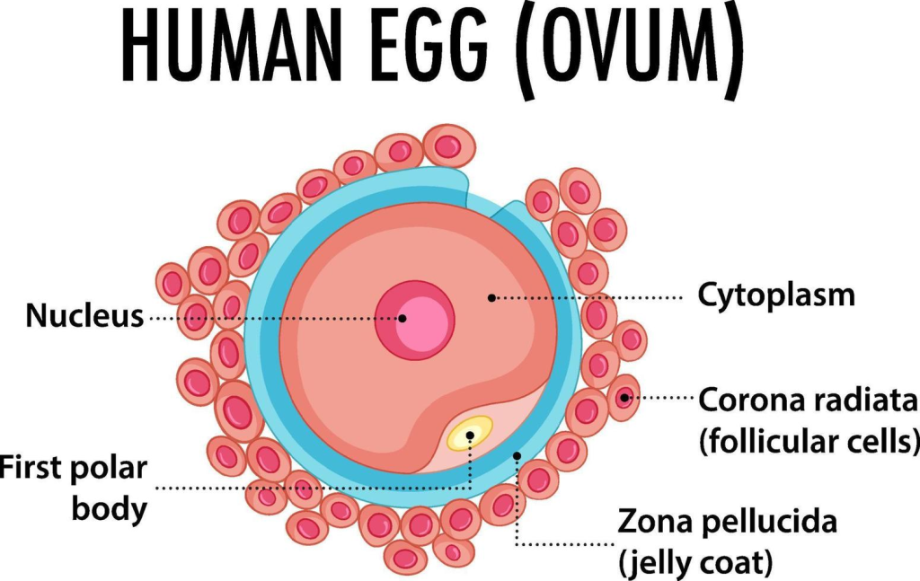 • ઓવમ મા, ન્યુક્લીઅસ , સાઇટોપ્લાઝમ ,ફસ્ટ પોલાર બોડી, ઝોના પેલ્યુસિડા (હાઇલ્યુરોનીક એસિડ),કોરોના રેડિયેટા ….જેવા પાટ્સ આવેલા હોય છે.
