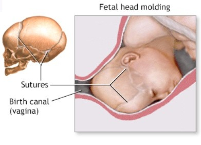 • હેડ- ફર્સ્ટ ડિલિવરી દરમિયાન, નેરોવિંગ બર્થ કેનાલ (વજાઇના અને પેલ્વિક બોન) ને કારણે માથા પર દબાણ ના કારણે માથા ને લંબચોરસ આકારમાં મોલ્ડિંગ કરી શકે છે.