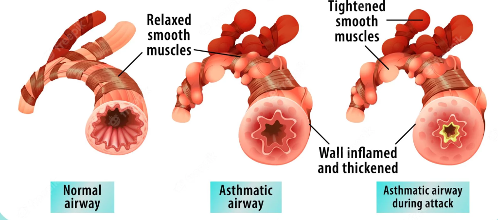 આથી એરવે માં ઇન્ફ્લામેશન જોવા મળે છે.જેના કારણે મ્યુકસનું હાઇપરસિક્રીશન, એરવે મસલ્સમાં કોન્ટ્રાકશન અને બ્રોન્કિયલ મેમ્બ્રેનમાં સ્વેલિંગ જોવા મળે છે.