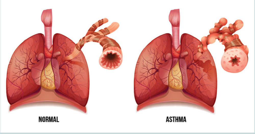 જેના કારણે એરવે નેરોવિંગ બને છે. જેથી કફ, ચેસ્ટ ટાઇટનેસ, શોર્ટનેસ ઓફ બ્રિથ અને વ્હીઝિંગ સાઉન્ડ જોવા મળે છે.