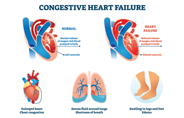 કંજેસ્ટિવ કાર્ડિયાક ફેઇલ્યોર(CCF) ને કંજેસ્ટિવ હાર્ટ ફેઇલ્યોર(CHF) પણ કહેવામાં આવે છે. જે ઇનએડીક્યુએટ કાર્ડિયાક આઉટપુટ કંજેસ્ટિવ કાર્ડિયાક ફેઇલ્યોર મા લંગ્સ ની આજુબાજુ ફ્લૂઇડ નું એક્યુમ્યુલેશન થવાના કારણે તથા હાટૅ નુ મસ્ક્યુલર લેયર એ થીકનિંગ થવાના કારણે હાર્ટ એ પ્રોપર્લી રીતે વર્ક(પંપિંગ) કરી શકતું નથી. તેથી હાર્ટ દ્વારા એડિકયુટેડ અમાઉન્ટ કાર્ડીયાક આઉટપુટ બોડી માં થય શકતુ નથી.