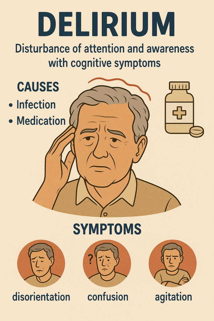 *આ એક એકયુટ (Acute) કોમન ક્લિનિકલ સિન્ડ્રોમ છે, જે રિવરસીબલ અને ઓર્ગેનિક કન્ડિશન છે, જેમાં વ્યક્તિને Confusion થાય છે અને જેમાં ડીસઓરિયેન્ટેશન અને પરસેપશન માં ડિસ્ટર્બન્સ થાય છે, તથા કોનસીયનેસ ઇમપેર્ડ થાય છે.વ્યક્તિ ધ્યાન કેન્દ્રિત કરી શકે નહિ અને તેમા એકયુટ કોગનિટીવ ડિસફંક્સન જોવા મળે છે તેને ડેલિરીયમ કહે છે.