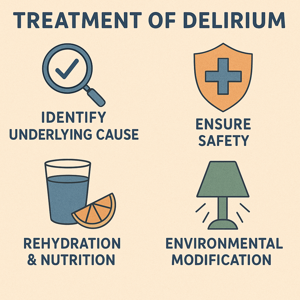 • Delirium ના કારણો જાણી અને તેનું તાત્કાલિક કરેક્શન કરવું.
