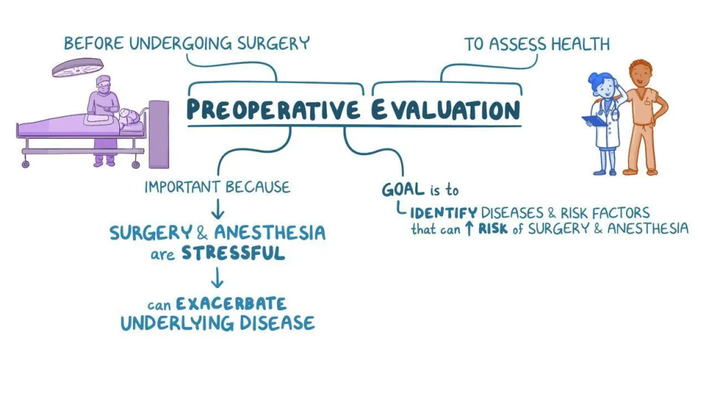 • પ્રી ઓપરેટીવ અસેસમેન્ટ એટલે કે ઓપરેશન પહેલાં પેશન્ટની કમ્પ્લીટ્લી મેડીકલ કન્ડિશનનું ઇવાલ્યુએશન કરવું. આ પ્રોસેસનો મેઇન એઇમ એ છે કે સર્જરી દરમિયાન કે પછી કોઇ કોમ્પ્લીકેશન્સ (Complications) ન ઊભી થાય અને પેશન્ટને સુરક્ષિત અને સફળ સર્જરી મળે. આ અસેસમેન્ટ multidisciplinary approach દ્વારા થાય છે જેમાં સર્જન (Surgeon), એનસ્થેસિયોલોજિસ્ટ (Anesthesiologist), નર્સ અને અન્ય મેડીકલ સ્ટાફ ઇનવોલ્વ હોય છે.